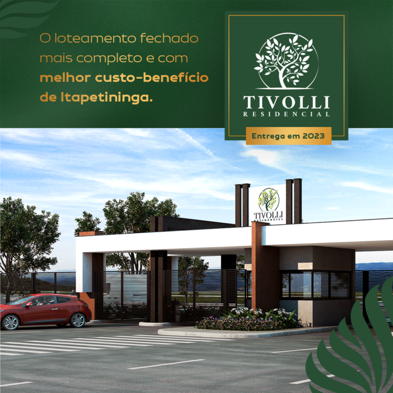 O residencial Tivolli tem 704 lotes residenciais, uma ampla área de lazer com campo de futebol, quadra de vôlei de areia, pista de caminhada, academia ao ar livre, playground e uma área verde com 35 mil metros.